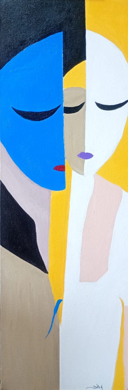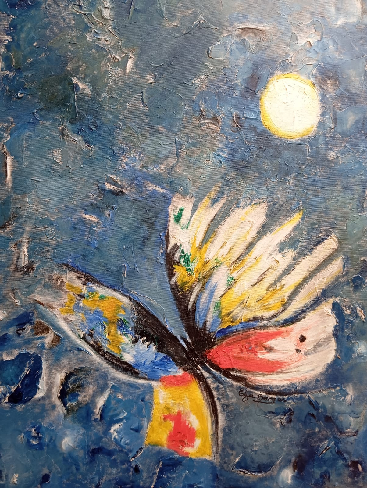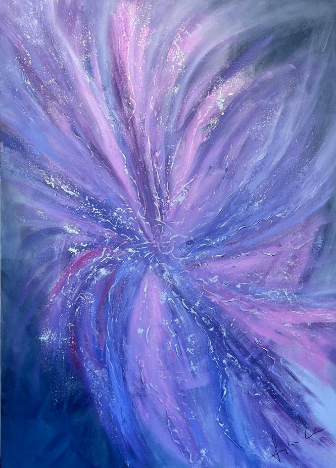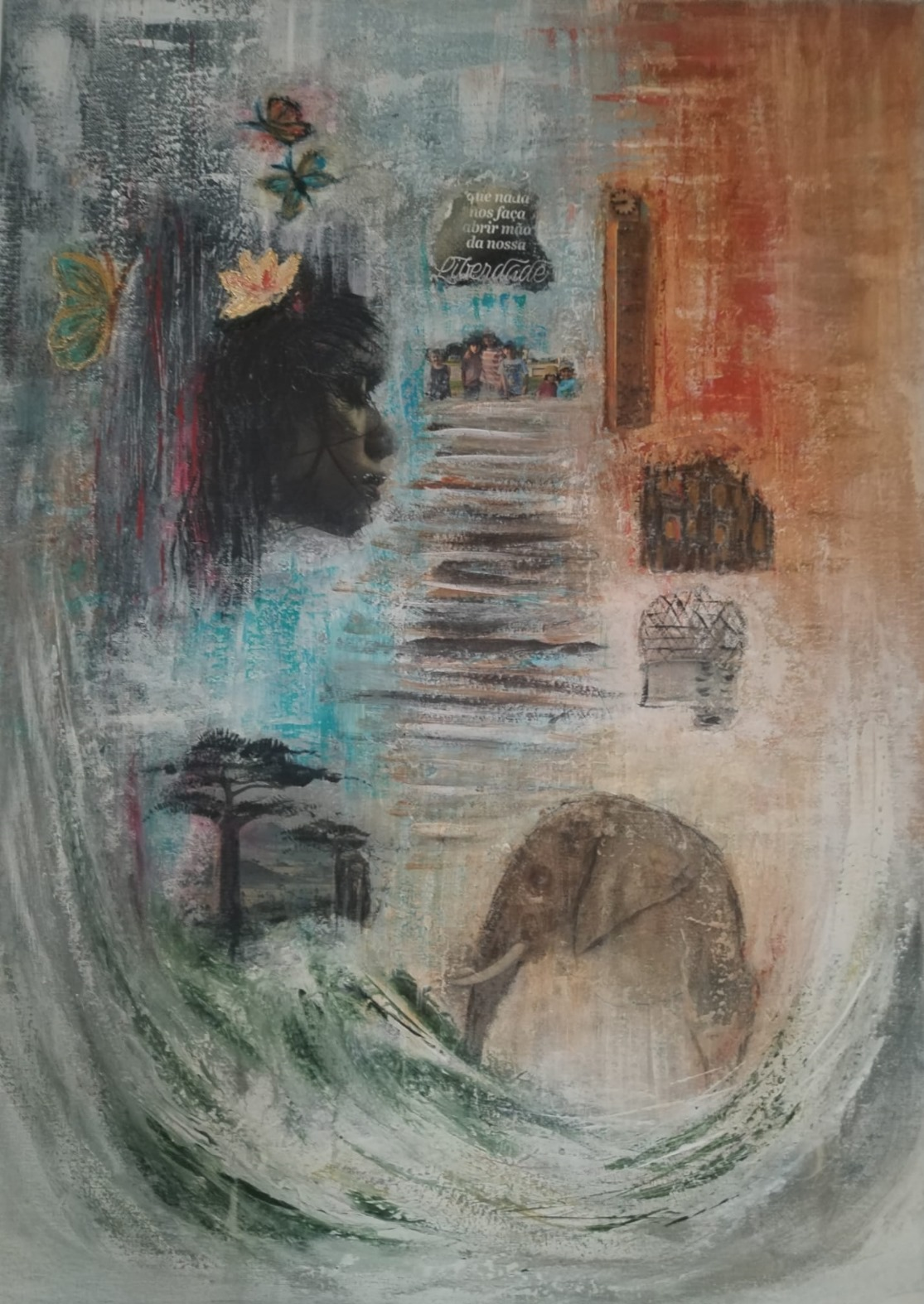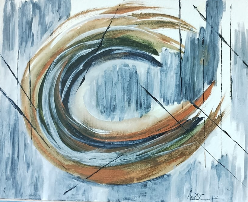 Esta tela representa uma trajetória da minha vida pessoal. Esta pintura expressa saudade, tristeza, alegrias, a minha força interior por cada desafio que enfrentei nestes 71 anos de vida e gratidão pela caminhada. De momentos de sombra que se elevam para momentos de luz.
