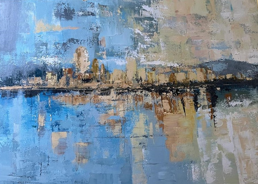 Quero passar através dele uma serenidade possível enquanto eu pinto com harmonia e também alegria. A escolha dessa ideia é que achei parecida com um pedacinho da cidade onde moro com um rio na orla da avenida.