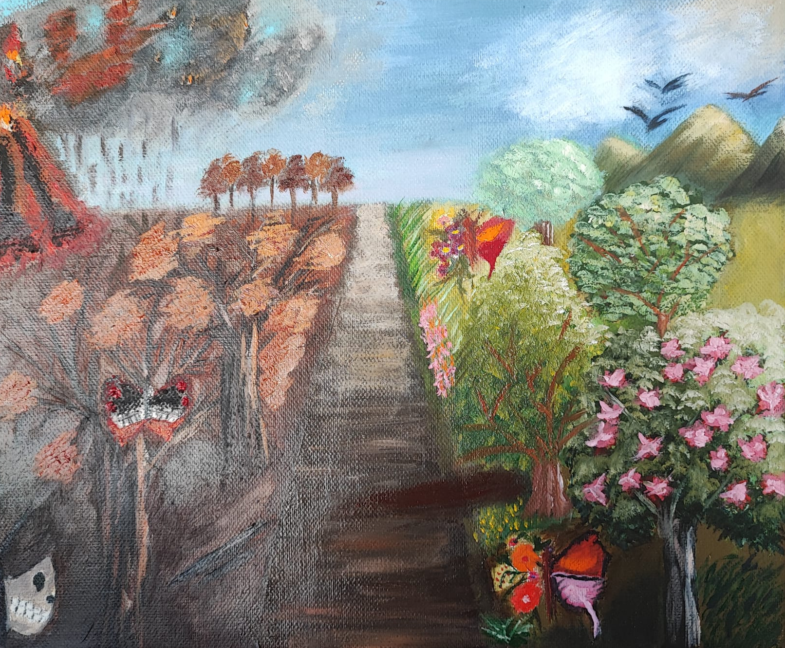 O mundo como o vejo: pessoas que com o seu egoísmo, mentira, oportunismo, ganância vai matando todo o nosso planeta e com ele a vida (no lado esquerdo a vida está simboliza da pelas árvores e borboletas). No lado direito, temos o planeta que todos desejamos e que pessoas sensíveis, serenas, empáticas, respeitadoras, com valores e moral tentam manter a todo o custo. Como disse, foi a primeira imagem que me surgiu e, embora muito ambiciosa pois não tenho referências, fui-me escudando na plataforma da professora, visualizando, várias vezes, os mesmos vídeos sobre paisagem. Acrescentar apenas que o vulcão, canto superior esquerdo, simboliza o mal é a luz, no canto superior direito, simboliza o bem.
