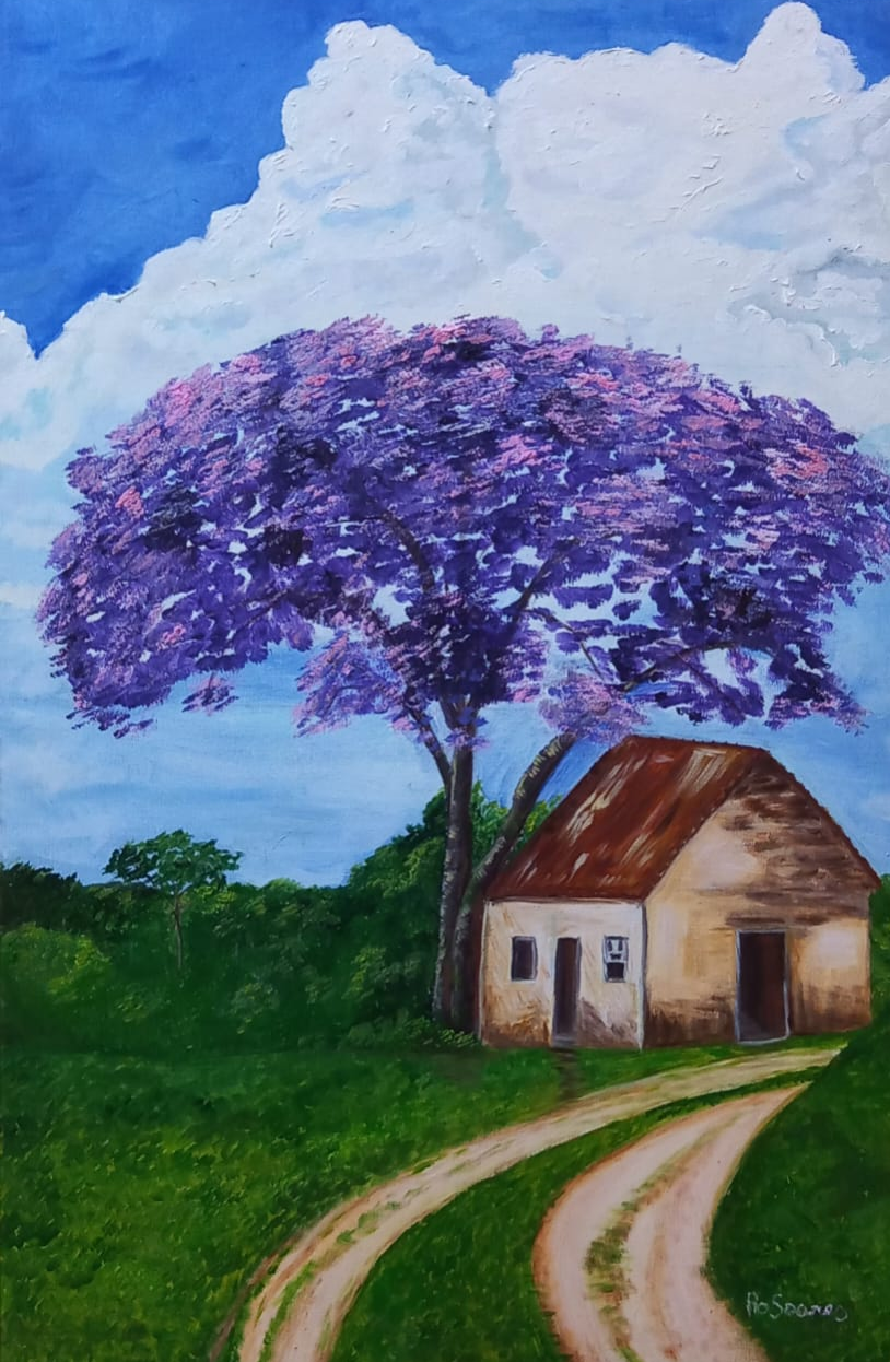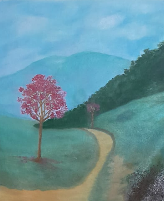 Esta paisagem me traz recordações do meu pai já falecido. Nós tínhamos uma chácara e o caminho desta pintura é muito parecido, eu me vejo neste caminho voltando ao passado.