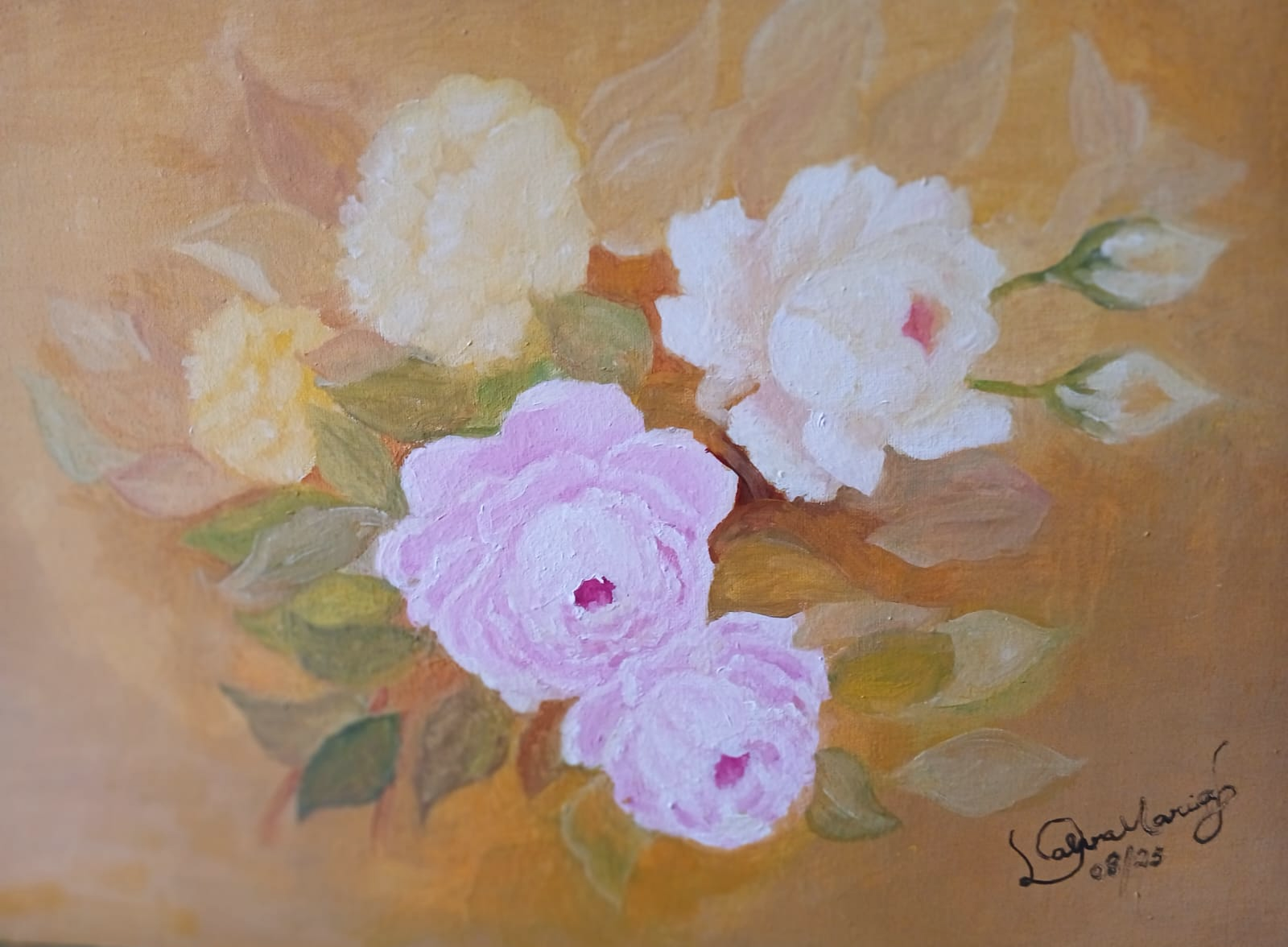 Minha consciência dita a minha voz para externar a alegria de " pintar óleo sobre tela". A flor que mais me atrai é a " rosa", que tem em suas delicadas pétalas, graciosas, todas unidas, suavemente, formando a beleza de sua forma. Elas fazem voltar a mim e lembrar o quanto a " arte" inebria meu "ser humano".