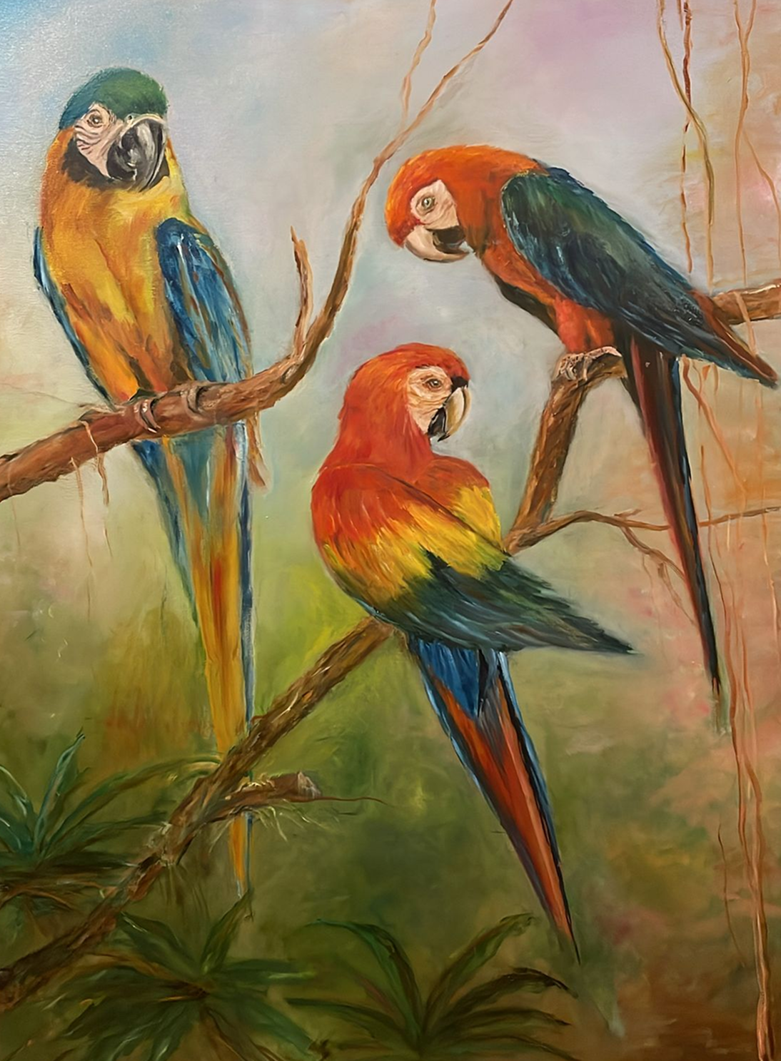 Esse quadro representa a minha lembrança da natureza e dos pássaros da fazenda que tive que vender no Brasil. Lá tínhamos muitas araras, tucanos, periquitos, papagaio e pássaros de todas as espécies. Se sentiam protegidos ali dentro da fazenda, onde ninguém os aprisionavam.