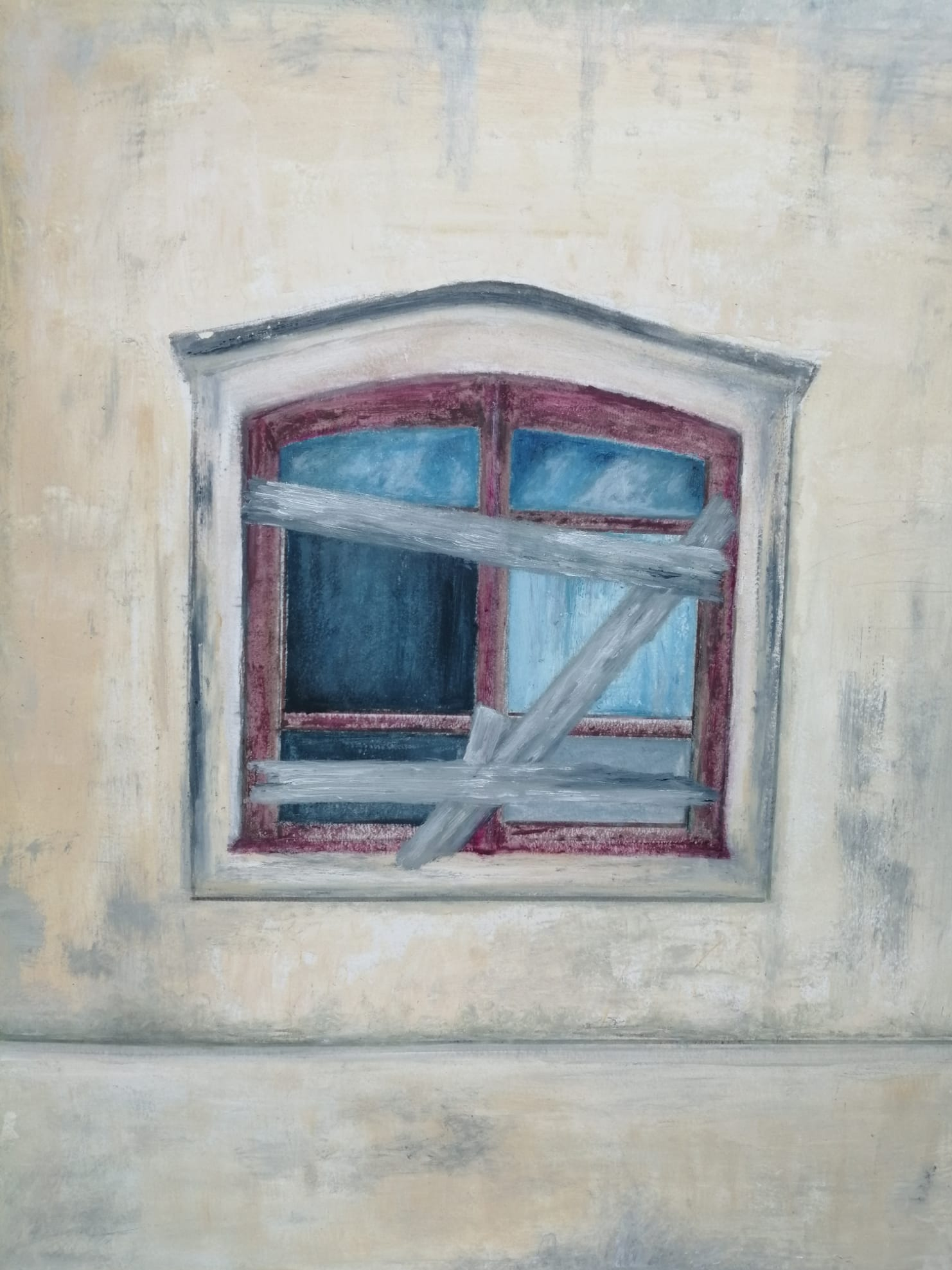 O que quis expressar nesta pintura, foi a resiliência, a teimosia de continuar a existir, mesmo decrepita, não quer abdicar da sua função: que é deixar passar a luz.