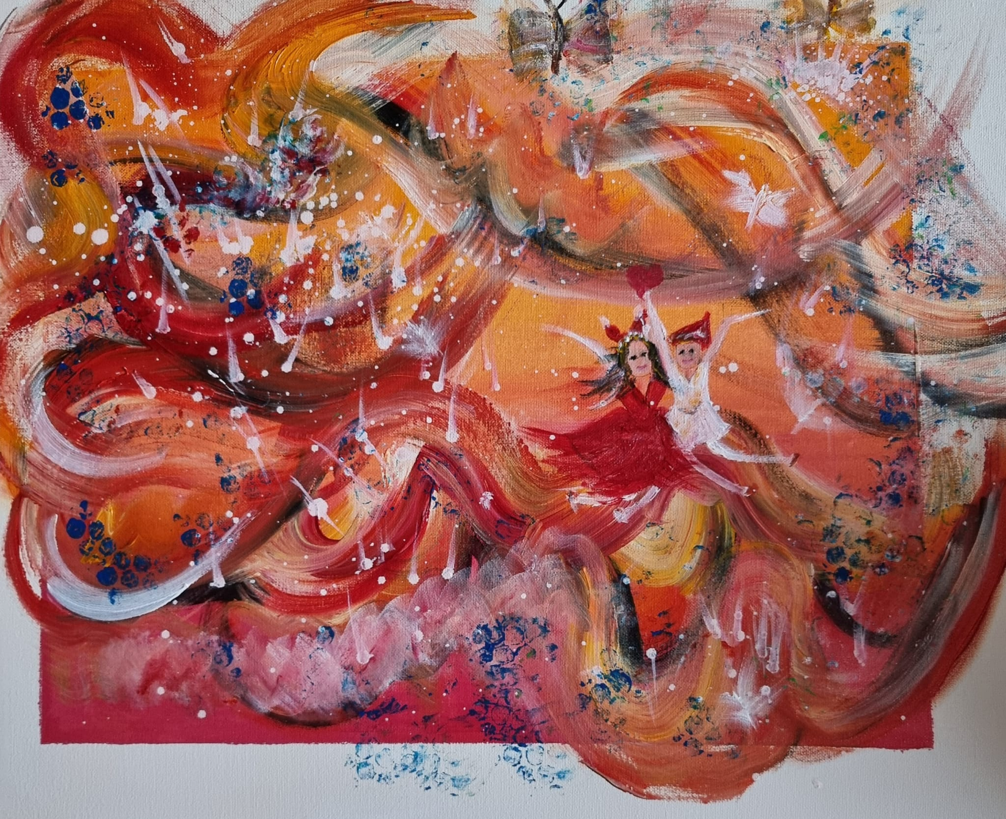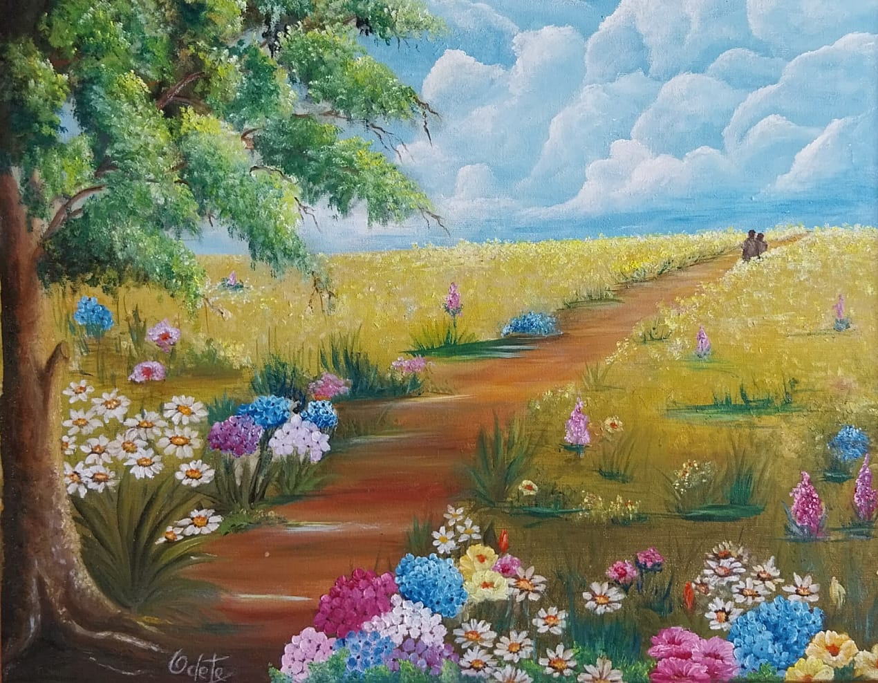 Chorava muito, após o falecimento da minha mãe. Sonhei com ela me chamando para conhecer a sua nova casa. Então me deparei com um campo muito iluminado, com muitas flores, e um caminho que percorremos...este sonho está gravado na minha memória há 38 anos. Agora pude levar toda a minha emoção através da pintura para esta tela.