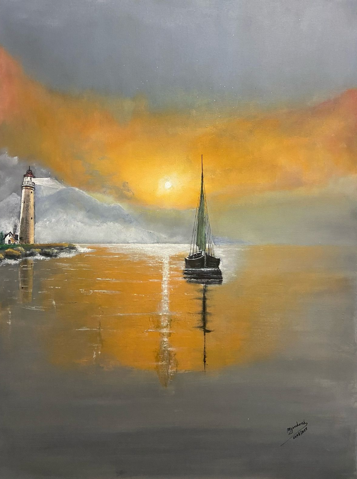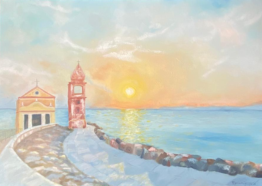 Nesta tela, sendo uma pequena homenagem à "Madonna dell'Angelo", na cidade de Caorle - Italia, cidade está que me deu tantas emoções, oportunidades de me reencontrar com Deus, com minha fé. A pequena igreja, que atravessou séculos, enchentes, e a 2ª Guerra, está na praia do "Levante", ou seja, o nascer do sol - uma explosão de cores.