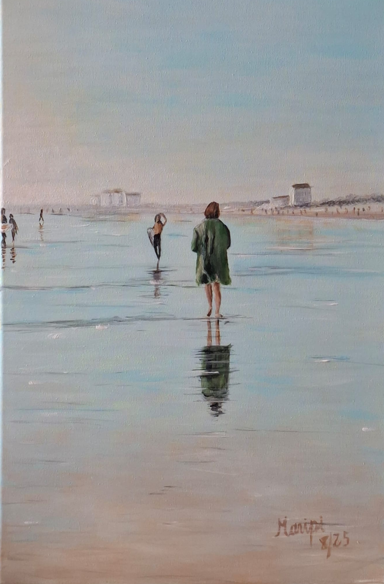 Desalento, melancolia, tristeza. Não fiz esboço, nem estudo de cores para esta pintura... Quando dei por mim, tinha a base pintada. O que expressa este quadro? Bem... as impressões não são iguais para todos, mas o que me veio à mente, quando fotografei esta senhora a andar na praia... numa longa maré vazante que se estendia até perder de vista, com neblina ao fundo... foi o desalento, a melancolia. A forma como caminhava, com os ombros curvados, vestido pendão, como se a roupa não lhe interessasse. O contraste com a paisagem e com os banhistas era tal...que julguei que carregasse um grande peso em cima dos ombros.